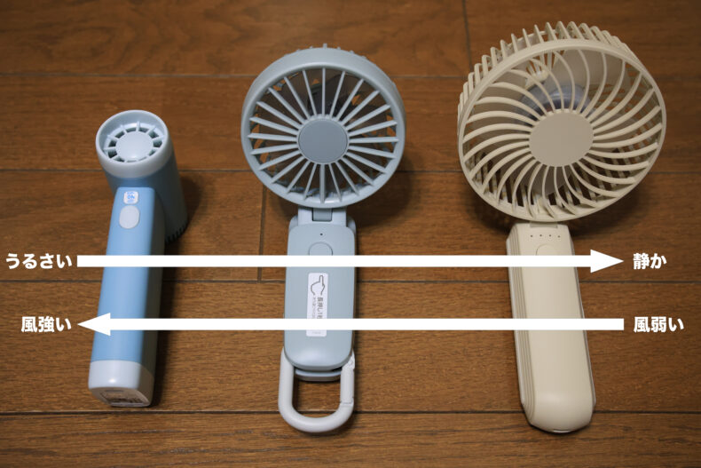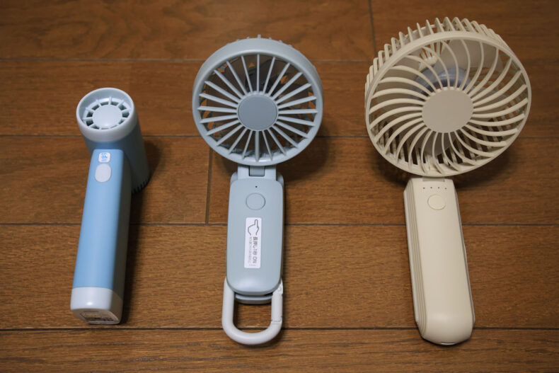ジェットハンディファン含めて並べてみるとこんなサイズ感です。これで風を比較してみると、