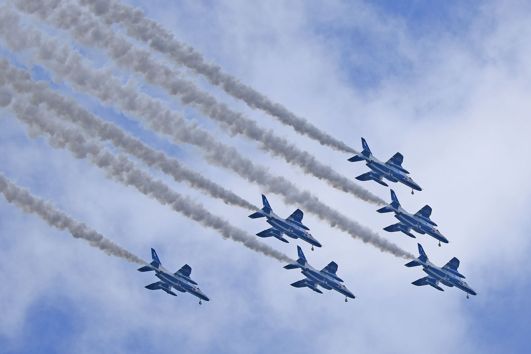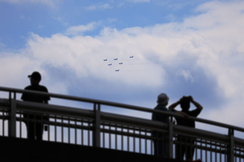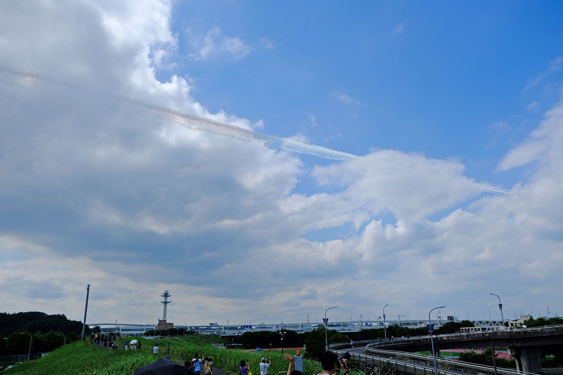 多摩川の方は人が多そうだし遠いし新横浜の方が穴場だろうと思って、港北インターそばの日産スタジアム裏の公園でスタンバイしていました。正午まで実施するかどうか発表されなくて気を揉みましたが、正午過ぎからいい感じに晴れてきました。都市部の展示飛行はある程度(今日くらい)雲があった方が見栄えすると思っています。