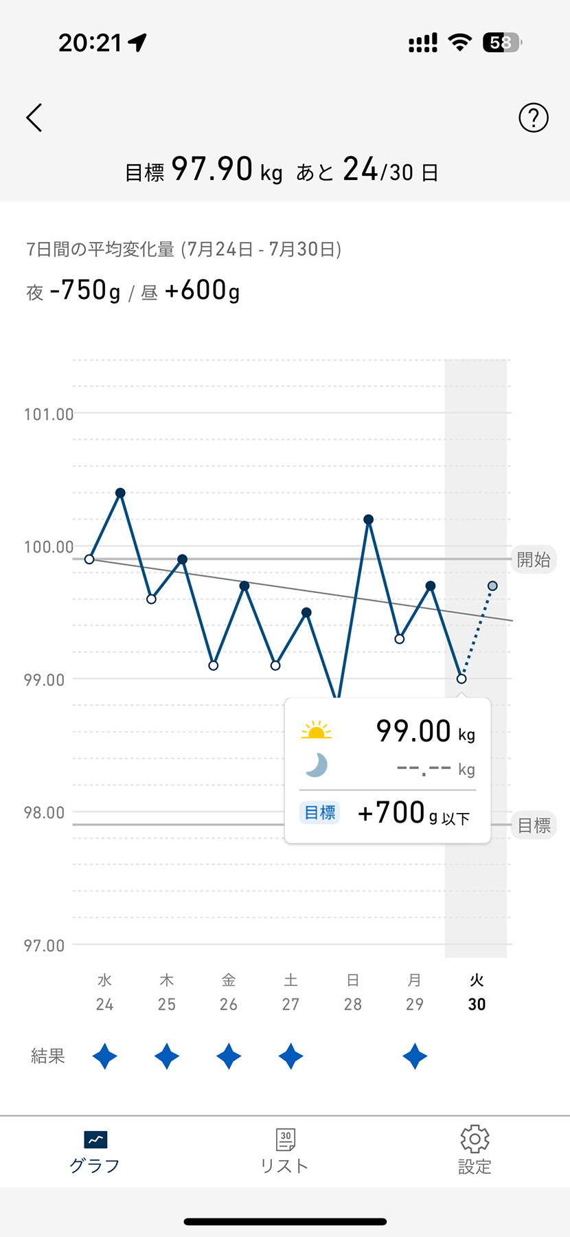 初期設定をしてスマホとのペアリングを済ませると、血圧計と同じように自動転送されます。それだけでもグラフ化はされるんですが、オムロンのスマホアプリ側に「朝晩ダイエット」という追加機能がありまして、実はそれもやっています。血圧計の時は追加機能なんていらないよと思っていたのですが、体重計の「朝晩ダイエット」は考え方が面白くて共感しました。