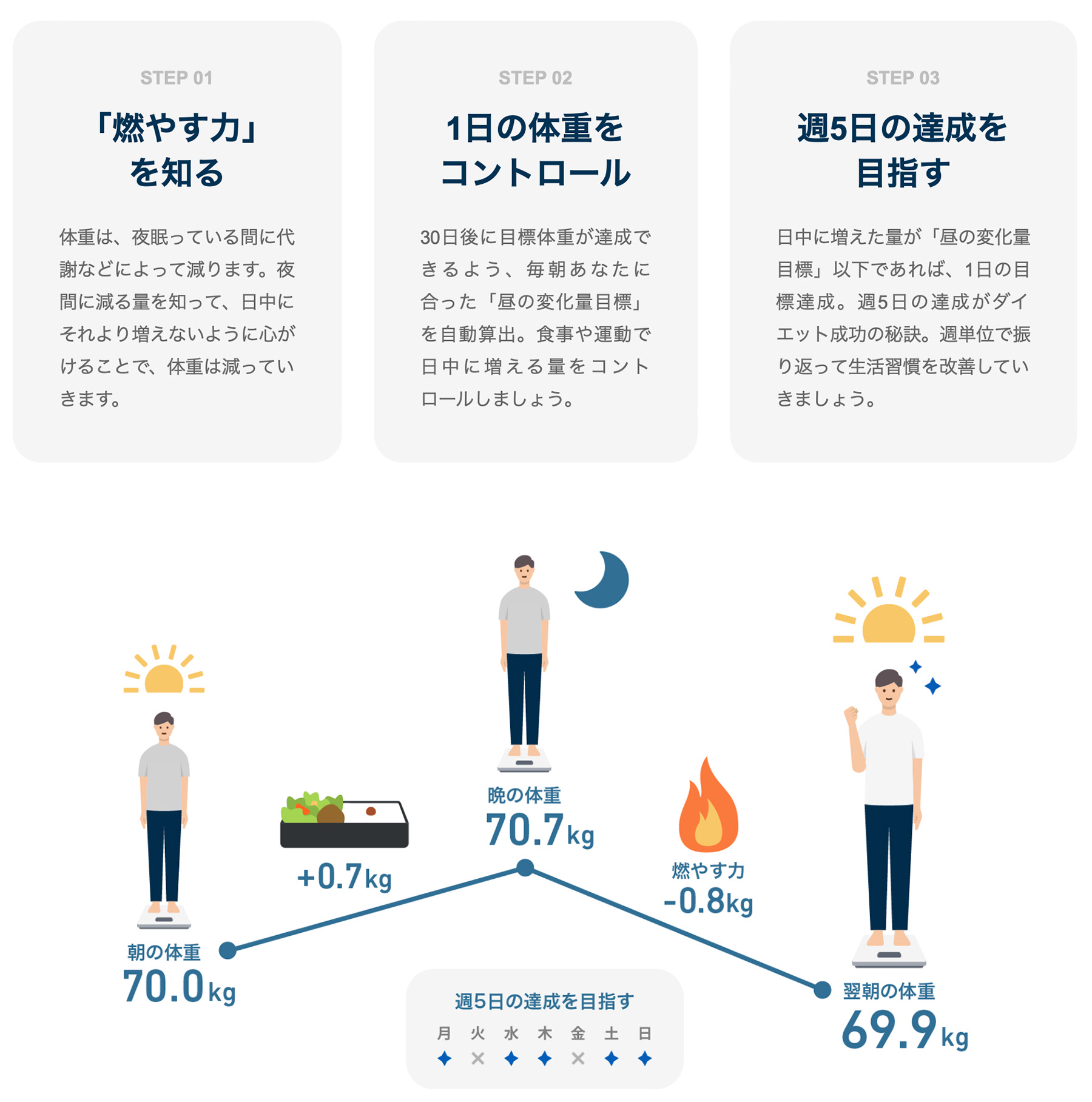 その仕組みですが…人間は夜間に痩せて昼間太るのだそうです。朝と晩に体重計に乗ることで、その人が夜間にどれだけ痩せるかが分かります。それを元に翌日の体重増加の許容目標をアプリが自動的に設定。その目標体重を超えないように1日を過ごすことで、ちょっぴり痩せます。これを繰り返すことで長期スパンでそれなりのダイエットが達成できるというものです。