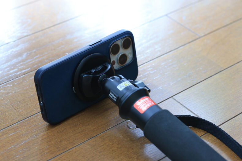 一脚に装着すれば自撮り棒的な使い方もできますが、雲台の可動範囲的にインカメラを自分側に向けられないことと、そもそも16万円もするデバイスを磁石1つで屋外で振り回す勇気はないので、実際にはこの使い方はしないと思います。