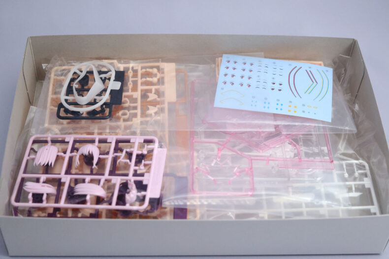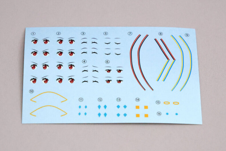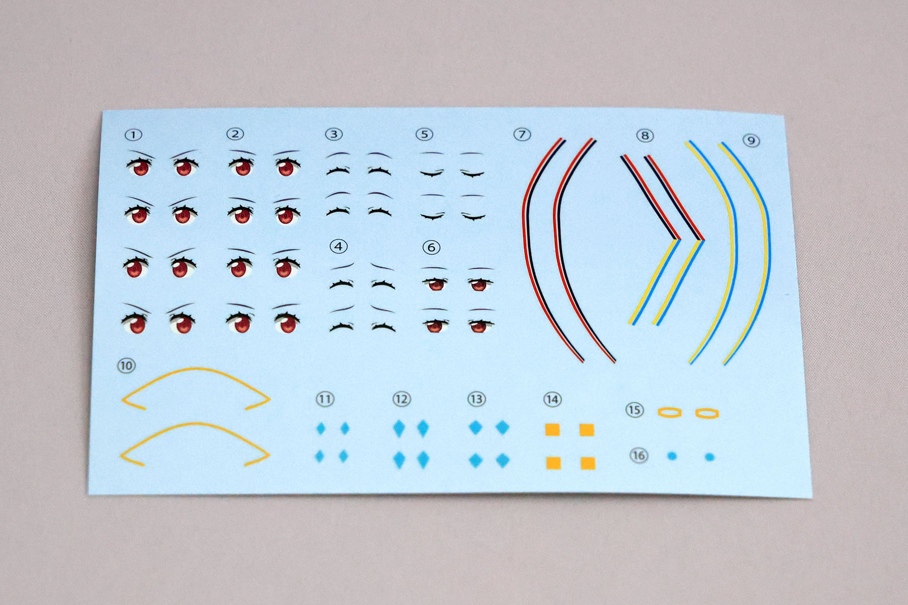 水転写デカール。肩のショールのラインはさすがにデカールでした。2本ずつあるのはスペアですかね。瞳はすでに顔パーツに タンポ印刷されたものが3種類付属しますが、そのほかに印刷なしパーツ用のデカールが付属します。