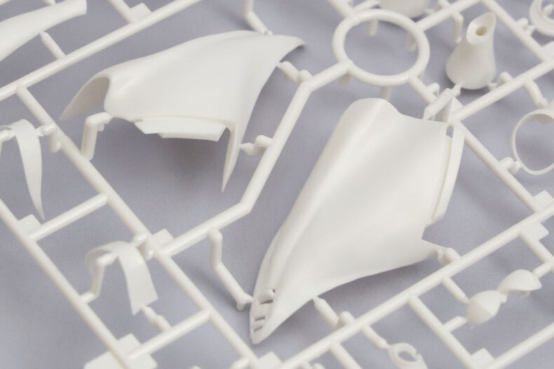これが一瞬「多色成形か?」と思った部分。腰のリボンの金色のストライプなのですが、多色整形ではなくパーツ分割でした。とはいえ多色整形ではないにしてもこれだけの複雑な曲面でパーツ分割できるのはCADのなせる技ですね。
