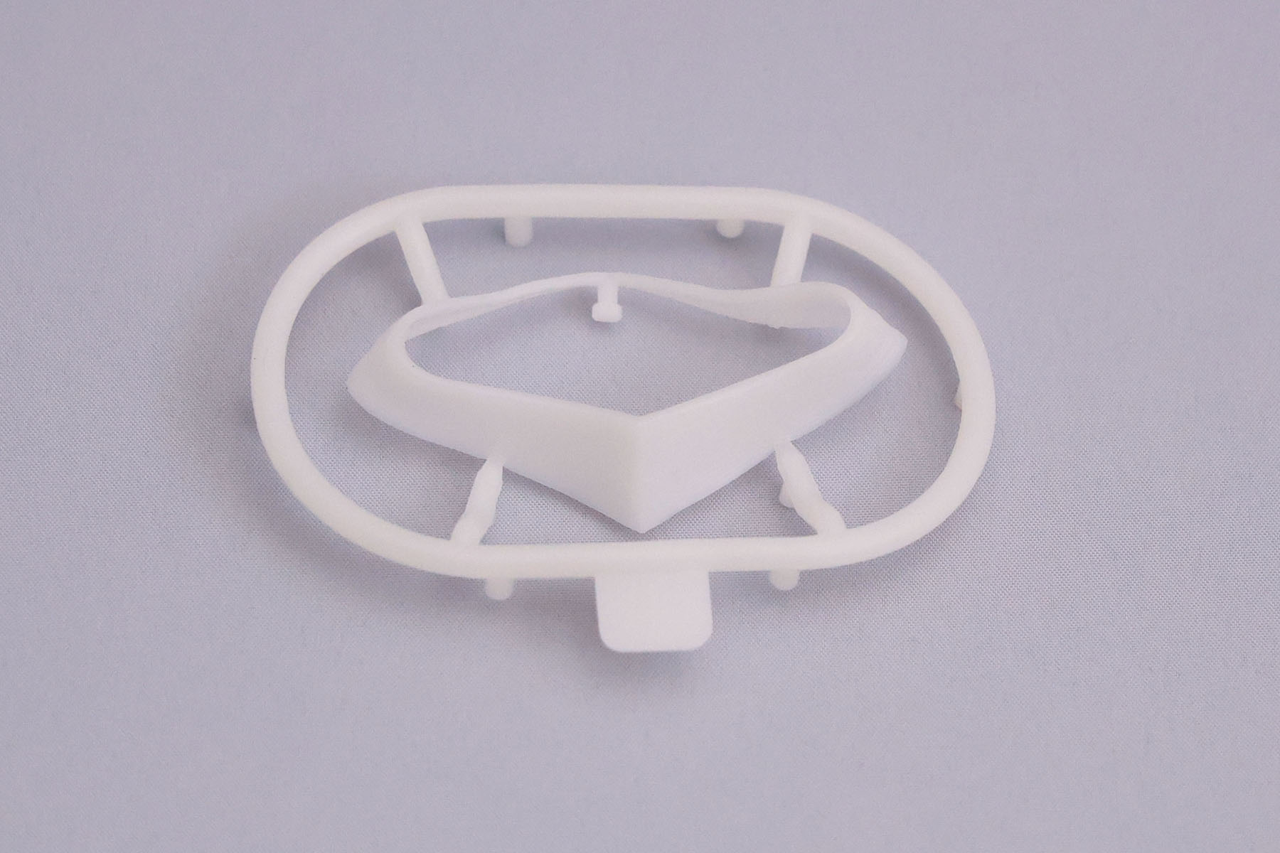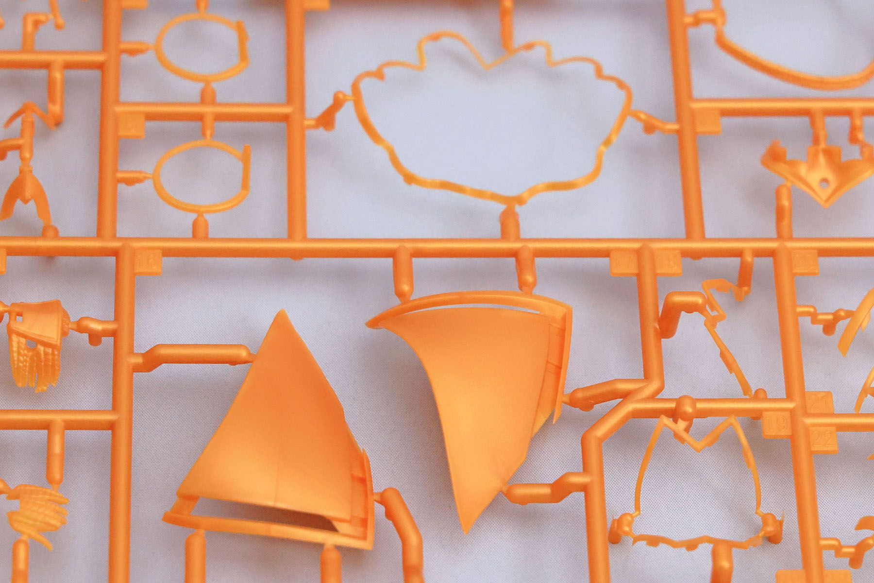 こちらがリボンの金色部分のパーツ。やはり金色はプラスチック整形色では再現が難しいので、塗ったほうがいいでしょうね。ウエルドラインも目立ちますし。もう何年もゴールドをエアブラシしてないので忘れちゃったなぁ…ゴールドに少し赤を混ぜるとこの色が出るんでしたっけ…?