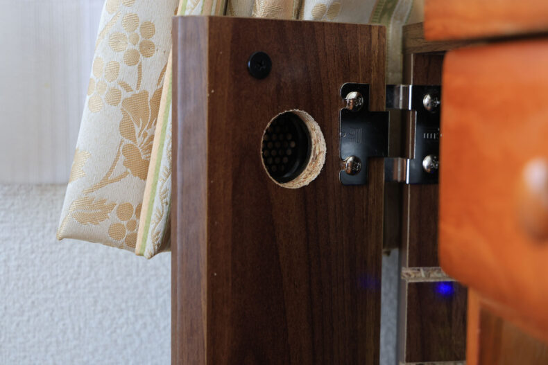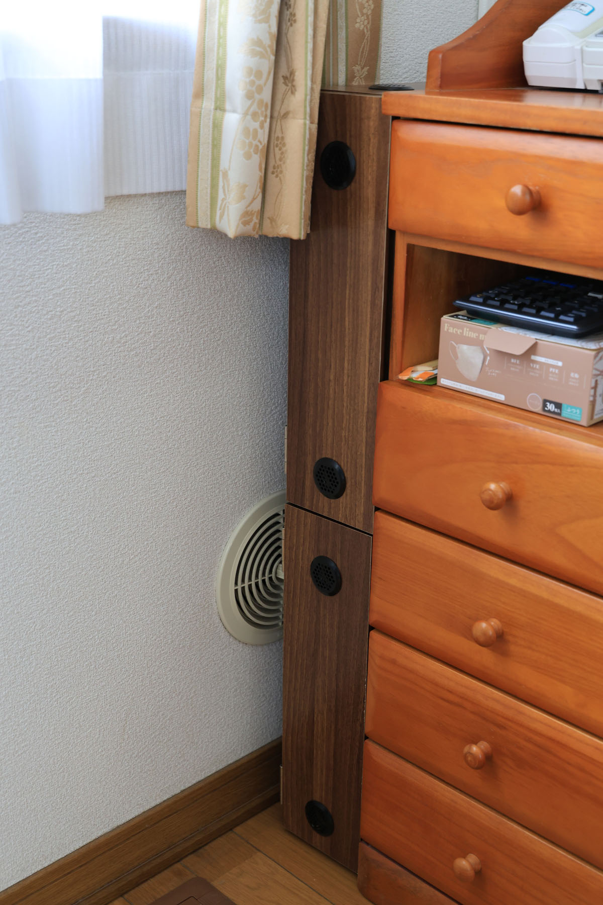 表側はこんな感じになります。ちょっと失敗したのは、「天面の左右センター」と「扉の左右センター」にそれぞれ穴を開けたのですが、天面と扉のセンターは設計上ズレているので、「天面の穴と扉の穴のセンターが揃っていない」という結果にwww ちょっとダサい見た目ですが、まぁいいや。DIYだし。普段見に行かないし。(でも作ってしばらくはちょいちょい手をかざして「フフフ、排熱してるしてる」とニンマリしていました)(←