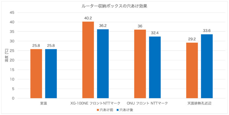 ルーター収納ボックスに入れた XG-100NE と ONU の熱がこもってしまい温度が高すぎる気がしたので、穴あけ加工をしました。結果、筐体温度を4度くらい下げることに成功しました。