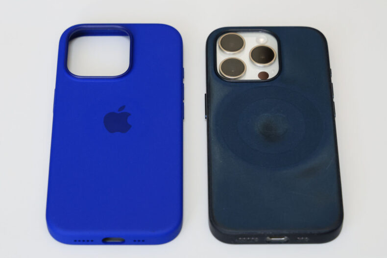 iPhone 15 Proのくたびれたファインウーブンケースとの比較。縦横ともわずかに大きくなっているのですが、持った感じは「言われればわかる」レベルの差です。それよりiPhone 15 Proからすると重量増の方が気になるかもしれませんね。iPhone 14 Proからだと僅かながら軽量化しているようです。