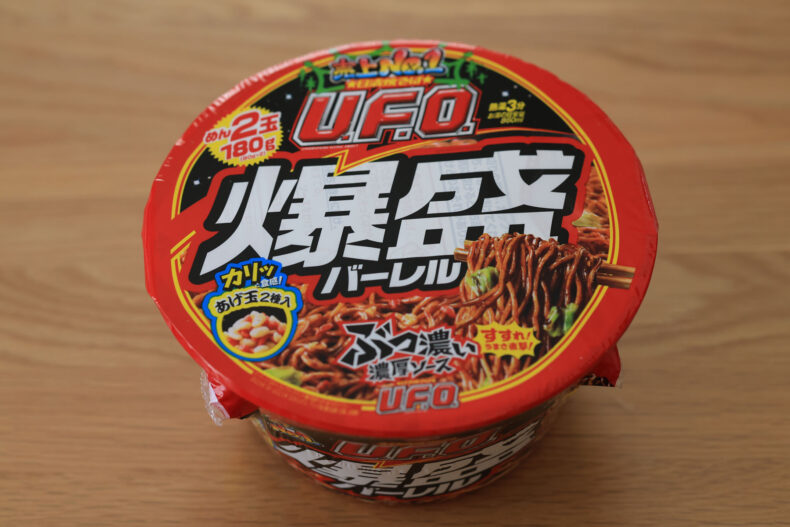 焼きそばUFO「爆盛りバーレル」。ペヤングの大盛り品のヒットの二匹目のどじょう狙いだと思いますが、何となく美味しそうだなと思い、自分の分と息子の分の2つを6月に買っていました。その後、私が入院し退院後も塩分制限がかかったので、こんな高塩分食品を私はもう食べないだろうと、息子が気を利かせて(←)私の分も食べてしまったようなのです。