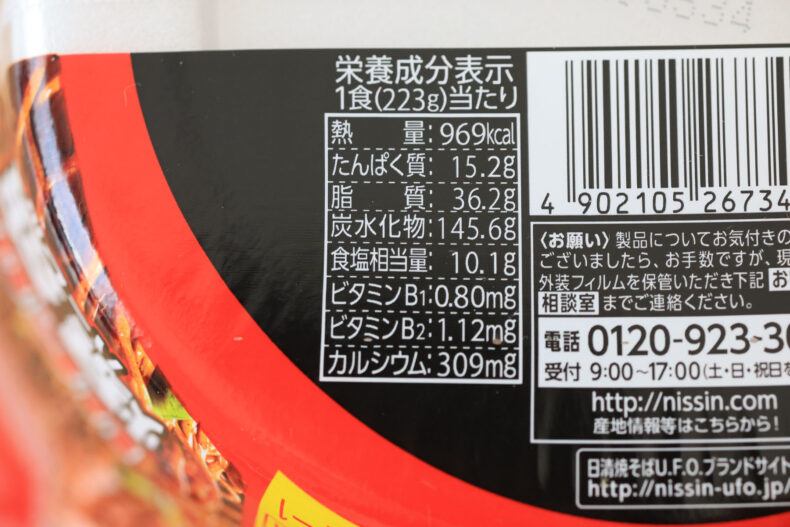はい、どこかの湯切り麺は湯切り後の塩分量が明記してあった記憶があるのですが、UFOはその明記がなく…