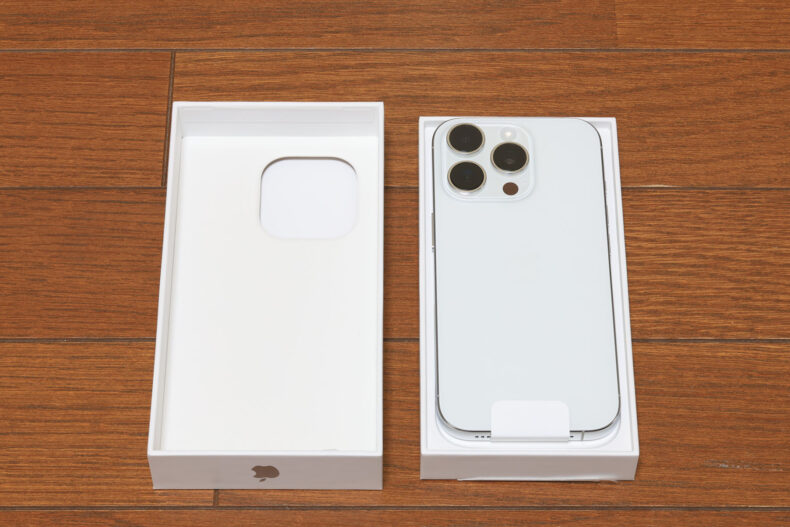 ほぼ同じ大きさに見えますが、iPhone 15 Proの箱よりフットプリントがやや大きく、厚みは薄くなっています。従って、この段ボール箱をiPhone 15 Proの下取りに利用すると、微妙に箱が潰れる可能性があります。