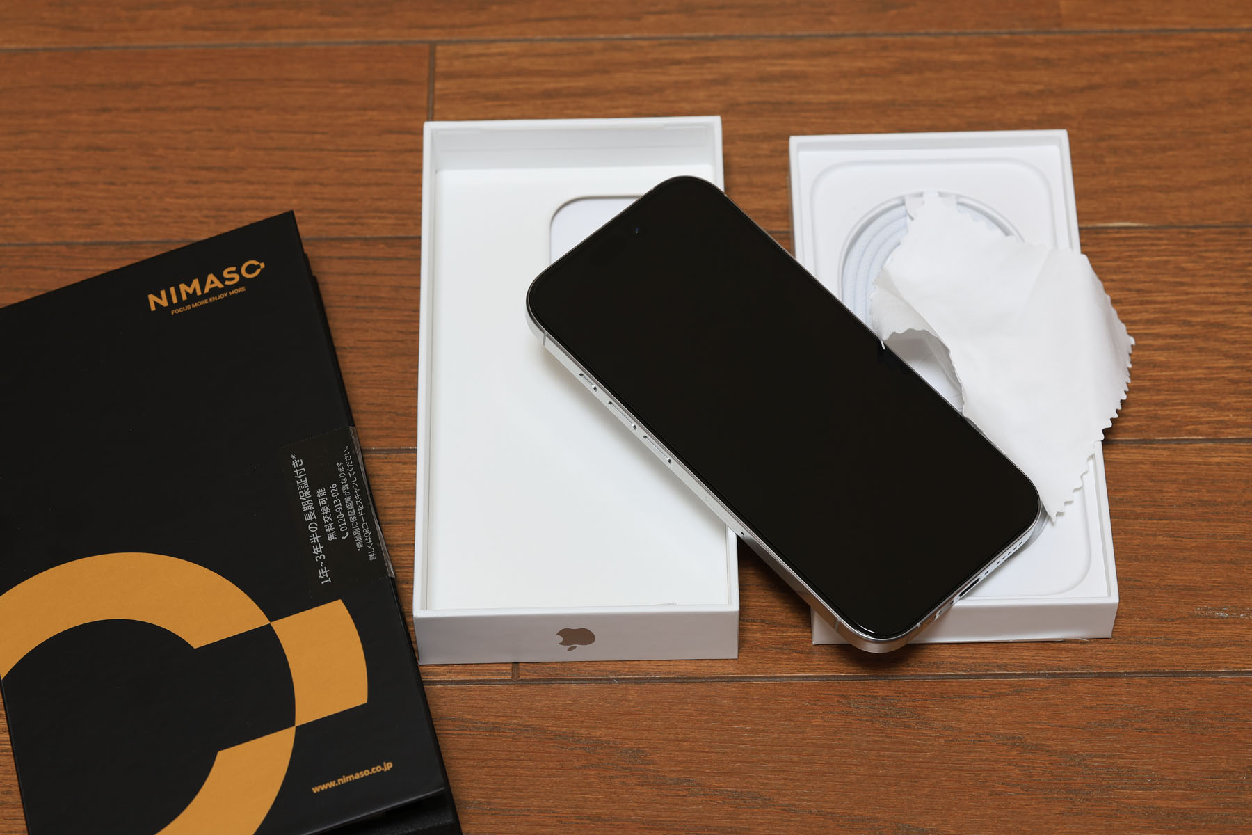 保護シートを剥がすと同時にNIMASO保護ガラスを貼り付けました。浴室でやったのですが裸にならなかったせいかホコリが混入し、3回くらい貼り直しました。世の中はホコリが入らない貼り付けキットが主流になりつつあり、かつ、実績もあるようなので、今後はそういうのにしようかと思います。