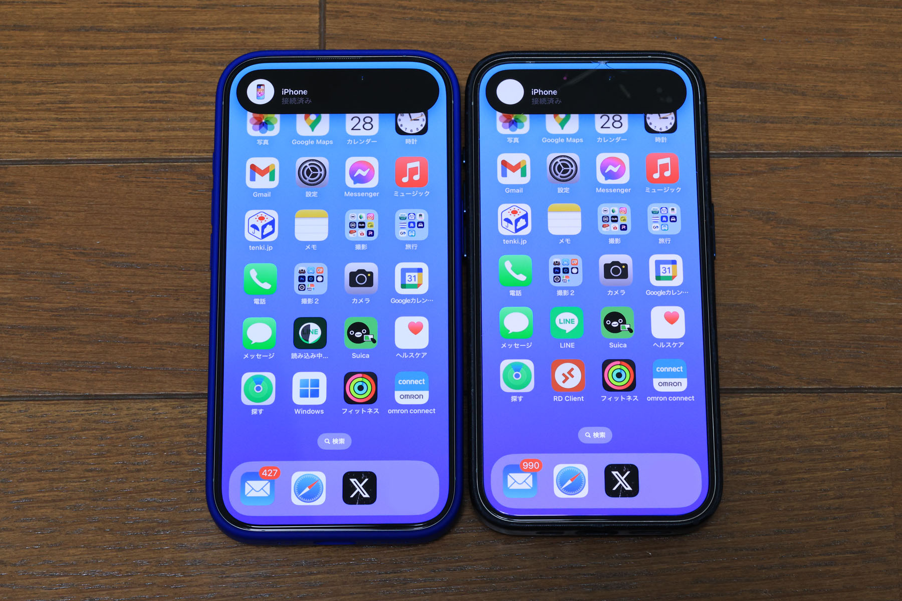 こっちはiPhone 15 Proは右です。写真でわかりにくいですが、15 Proの方が画面が青白いです。実は15 Proを買った時も、「14 Proの方が青白いなぁ」と思った記憶があり、有機ELが1年の経時変化で青白く転ぶのかも知れません。