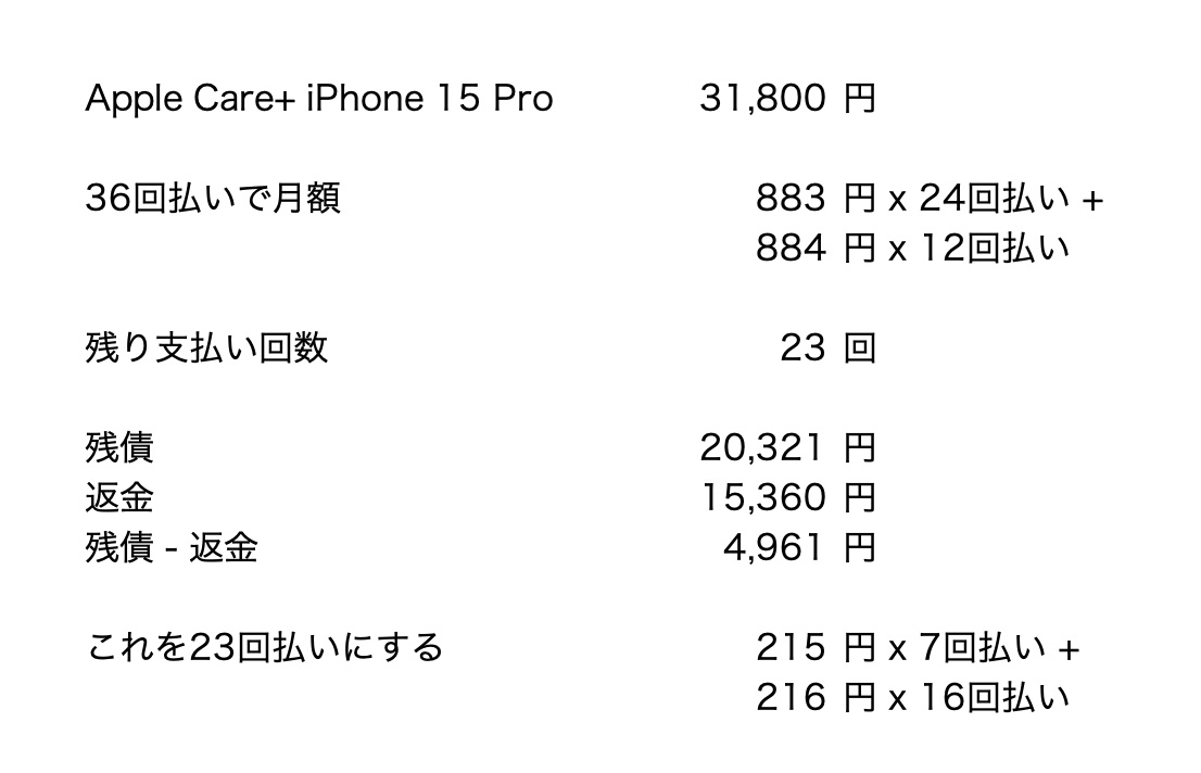 とのことで、これを念頭におく必要があります。現時点で Apple Care+ for iPhone 15 Pro 分として 883円 × 24回払い + 884 × 12回払いの契約があり、今日時点で残り支払い回数23回です。残債は 883 x 11 + 884 x 12 = 20,309円になります。ここに 15,360 円の返金が、Appleからペイディに対して入りますので、残債 – 返金は 4,961円になります。これが残り23回払いになりますので、215円 × 7回 + 216円 x 16回払いの支払いが残るのです。(…ですが、Paidyの画面で確認したところ、215円じゃなくて216円で引き落としされる予定になってるんですよねぇ…なぜ計算が合わない…)