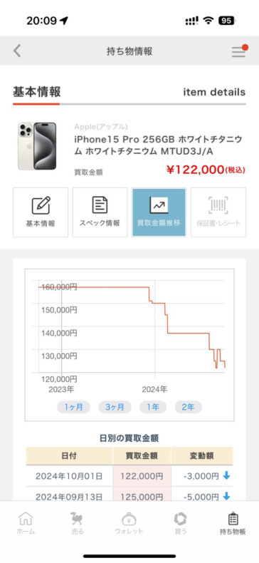 売却可能になったタイミングが 9/28 で、10月に入ると「誕生月キャンペーンで買取額 +5%」が付くのはわかっていたのですが、現在の iPhone の買取価格がそもそも「メガ買取最大1万円増額キャンペーン」適用後の価格であることと、キャンペーンは二重に適用されないことから、10月を待たずに速攻売却しました。結果、10月に入ってから買取額が 3,000円ダウンして 122,000円 になっていたので、9/28 に売り抜けられてよかったです。当初の IPhone 16 Pro の納期が 10/2~10/9 だったので、それだと買取額はダウンしちゃってましたよね。