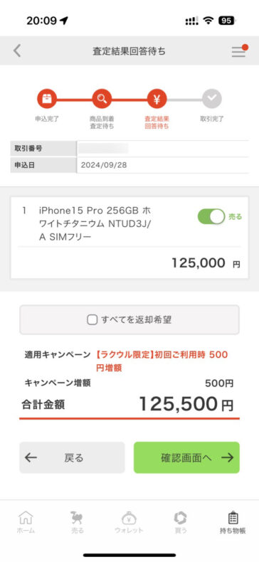 iPhone 15 Pro の売却が完了しました。125,000 円になるというので、メルカリではなくビックカメラ・ソフマップ系列の「ラクウル」に売りました。メルカリでなければ当初はイオシスにしようと思っていたのですが、修理交換品(型番が MTUD3J/A から NTUD3J/A に変更)だと減額になるというので、修理交換品でも減額されないラクウルにしました。バッテリー残量 100% の個体だったのでメルカリでも 140,000円 で売る自信はあったのですが、手数料(14,000円)と送料(750円)を差し引くと 125,250円となり、リスクのある取引の割には買取業者と大差ないと思い止めました。1万円くらい高く売れるならメルカリにするのですが。