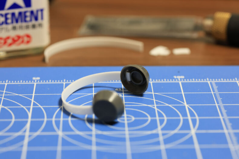 タミヤのプラバンでヘッドホンのバンドを切り出し、すり鉢棒に巻きつけてラップで固定し熱湯に漬け曲げぐせをつけます。バーニアノズルにバンドが貫通する穴を開け、通して接着します。バンドの長さは現物合わせです。