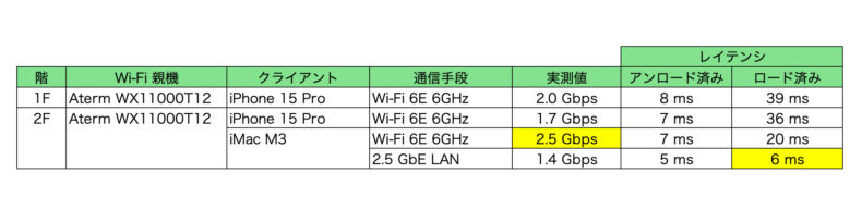 Wi-Fi が 5GHzだった頃は、iPhone 15 Pro で実効速度0.9~1.2 Gbpsだったので、ざっくり1.5倍くらいは速くなってるように思います。特筆すべきは黄色の部分で、iMac M3 が 2.5GbE LAN より速い Wi-Fi 速度を叩き出してるんですよねぇ。ですが「ロード済みレイテンシ」(クライアント機器が複数台ある状況下でのレイテンシ)を見るとやはり有線 LAN が有利で、体感上も 2.5GbE LAN の方が引っ掛かりが少ない感じです。
