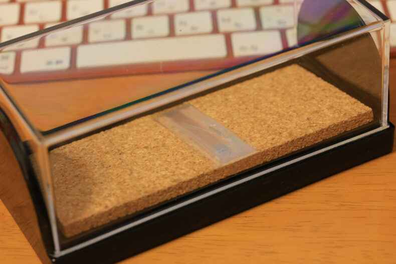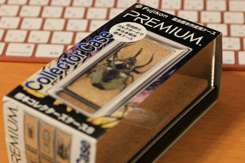 標本用なのでコルク板と虫ピンが付属しますが、今回は使わず。さすがに百均のケースと比べて平滑度、透明度が違います。