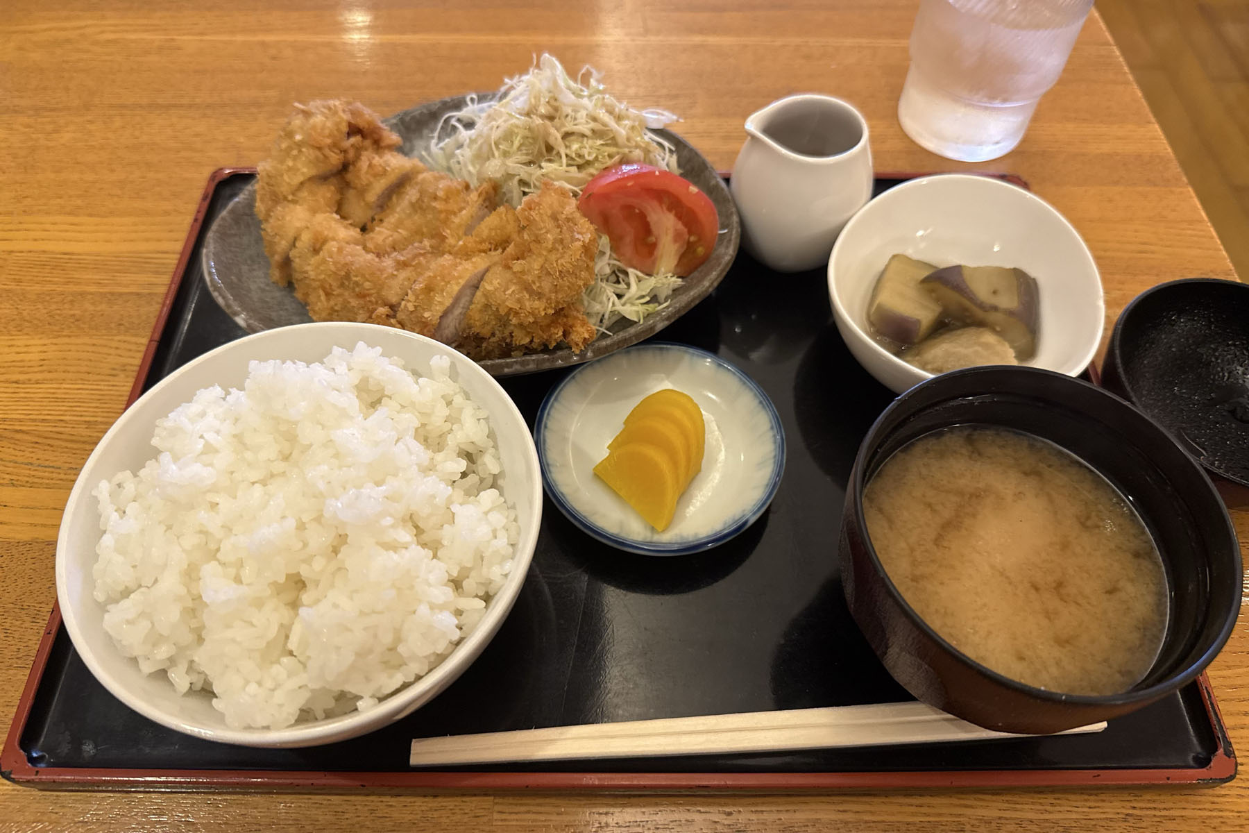 チキンカツ定食は通常、大きさを誇るみたいなところがありますが、こちらのチキンカツは慎ましい感じで、トレイ全体もコンパクトです。4人でテーブルに座っても邪魔にならない大きさです。右上のナスは煮浸し…とも違う、炒め煮浸しでしょうか。カツ定食にしてはデフォルトサイズでご飯が多いと思いました。コンパクトだけどガツンとくる、仕事飯といった感じです。なおいくらか足すとチキンカツを2枚にできます。
