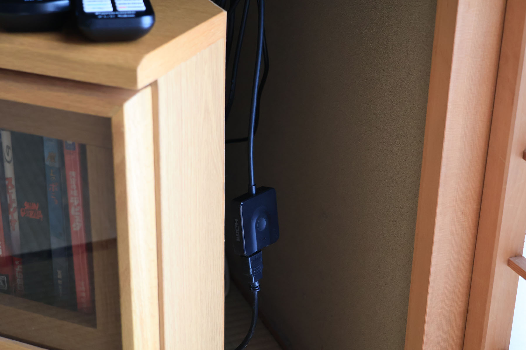 これをテレビの HDMI 4 端子にぶら下げ、テレビの横下に回ればアクセスできるようにしました。めでたし。ケーブルを揺らすと一瞬映像がちらつくことがあるのですが、まぁ使用中は動かさないし、許容範囲でしょう。