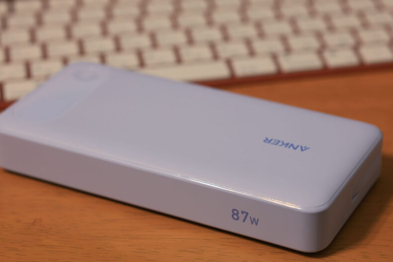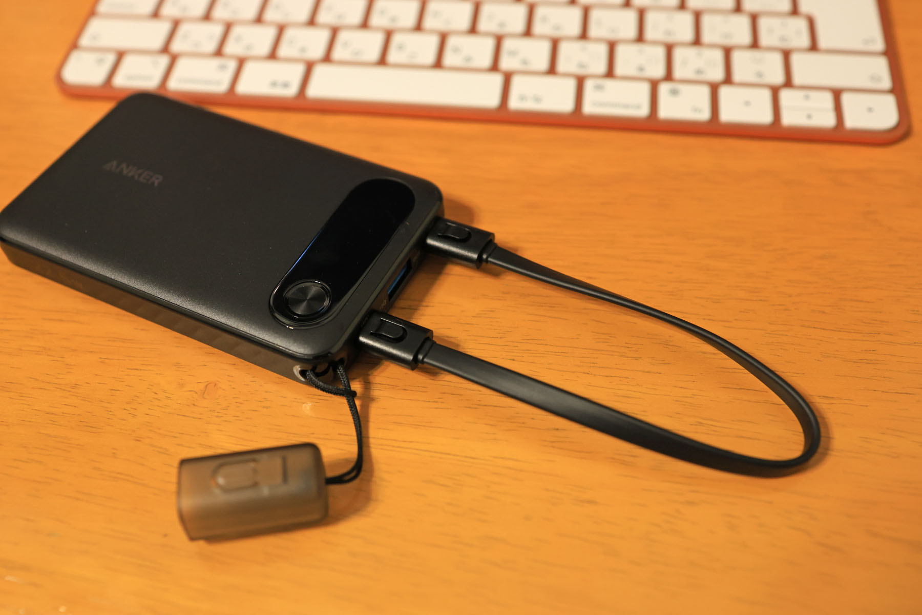 でも私自身がこっちのチームの設計思想を気に入ってしまい、兼ねてから欲しかった「20000mAh 級の、PD で 30W 以上出せるモバイルバッテリー」を購入しました。Anker Power Bank (20000mAh, 87W, Built-In USB-C ケーブル)です。これ: