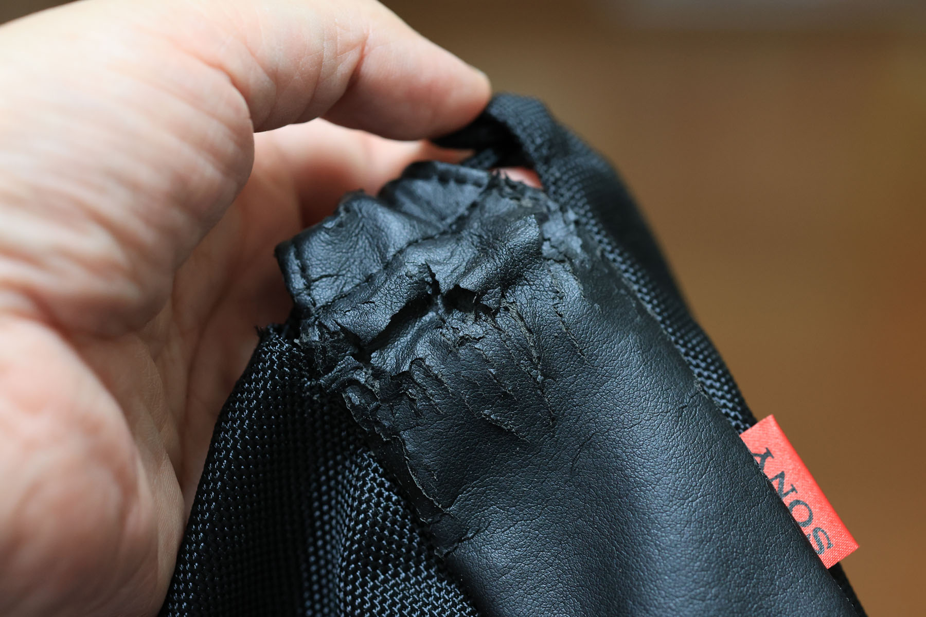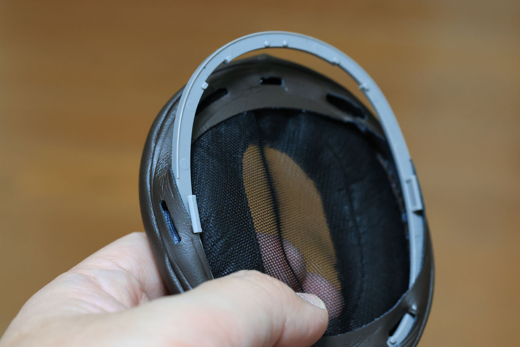 新しいパッドにフレームをつけたところ。結構きつくて、合成皮革が破けそうなくらい伸ばさないと入りません。パッドの内側が赤い方が右側、フレームにある「・・」が下側だと思います。