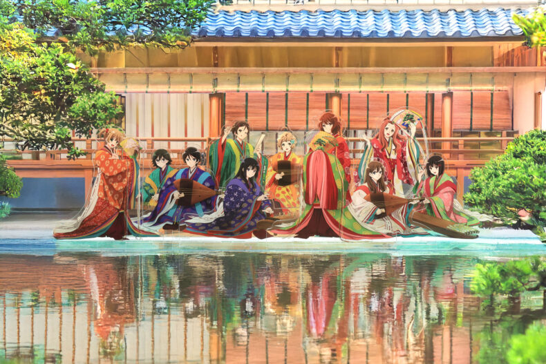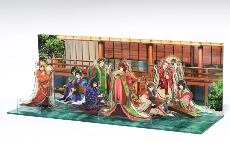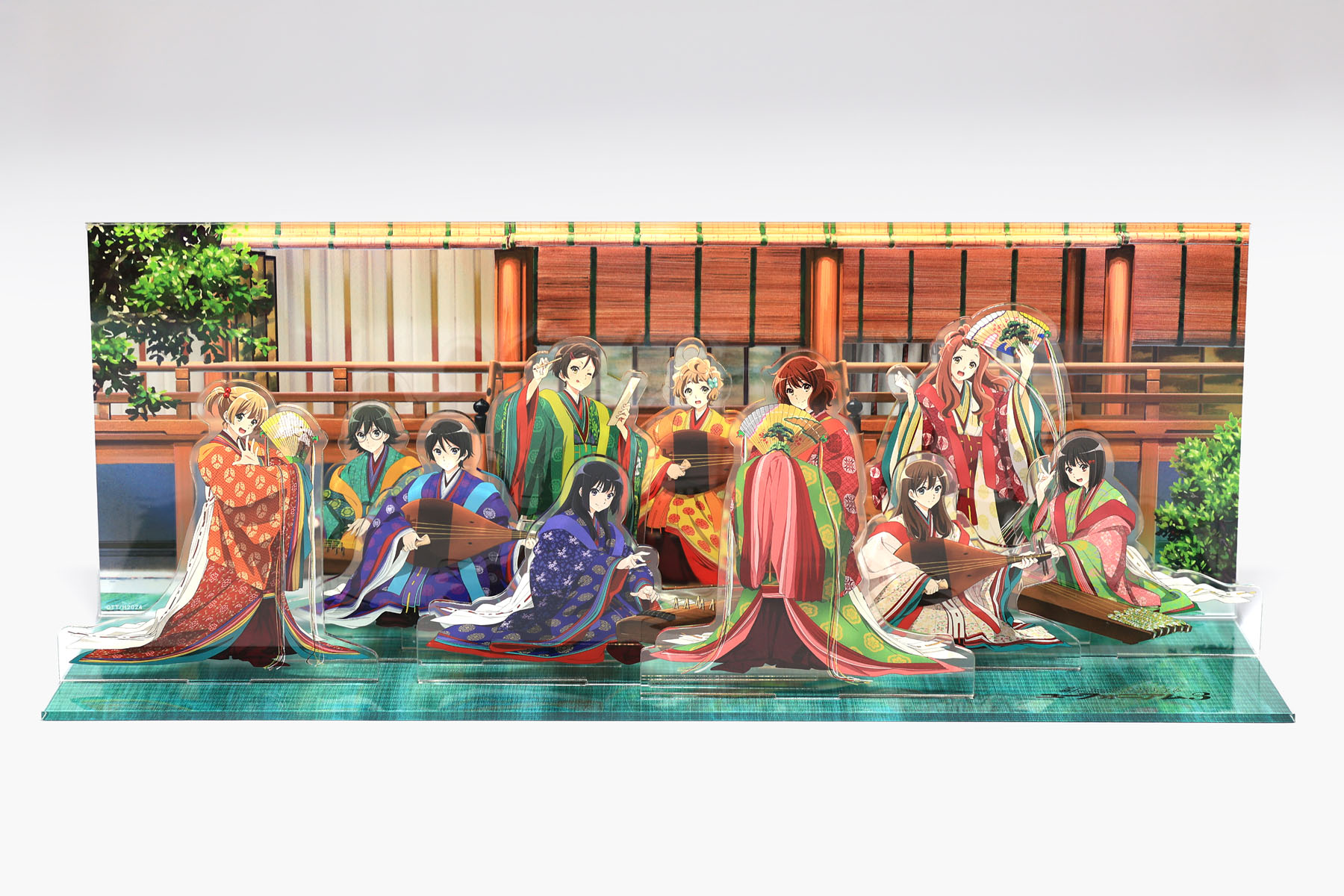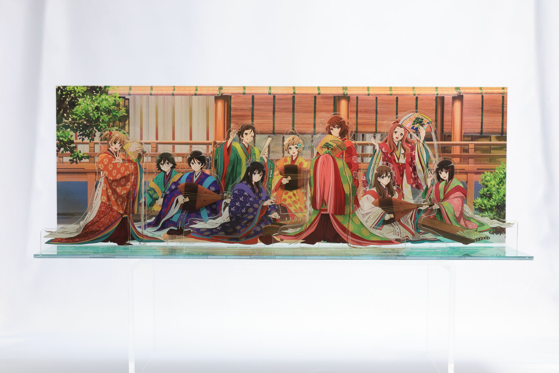 宇治市の「京都アニメーション×紫式部ゆかりのまち宇治」キャンペーンのために描き下ろされた平安装束姿の「ユーフォ」メンバーのジオラマアクスタです。ジオラマというくらいなので、背景付きのパネルに各キャラが奥行きを持って配置されています。