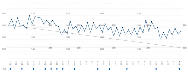 目標 -1.9kg に対して、減った量 -0.7kg 。1ヶ月の推移はこんな感じです: