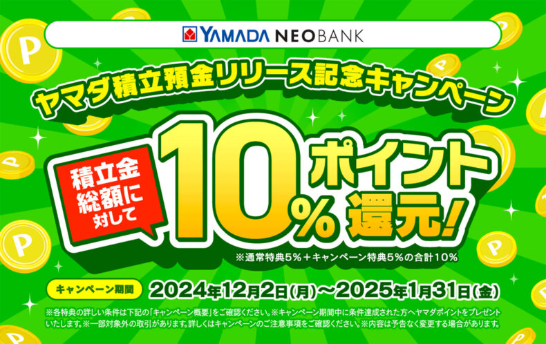 ヤマダ電機が「YAMADA NEO BANK」口座を利用して10%ポイント還元キャンペーンを開催するようです。ただし期間は12/2~とのことで、まだトップページから直接リンクは貼られていないようです。