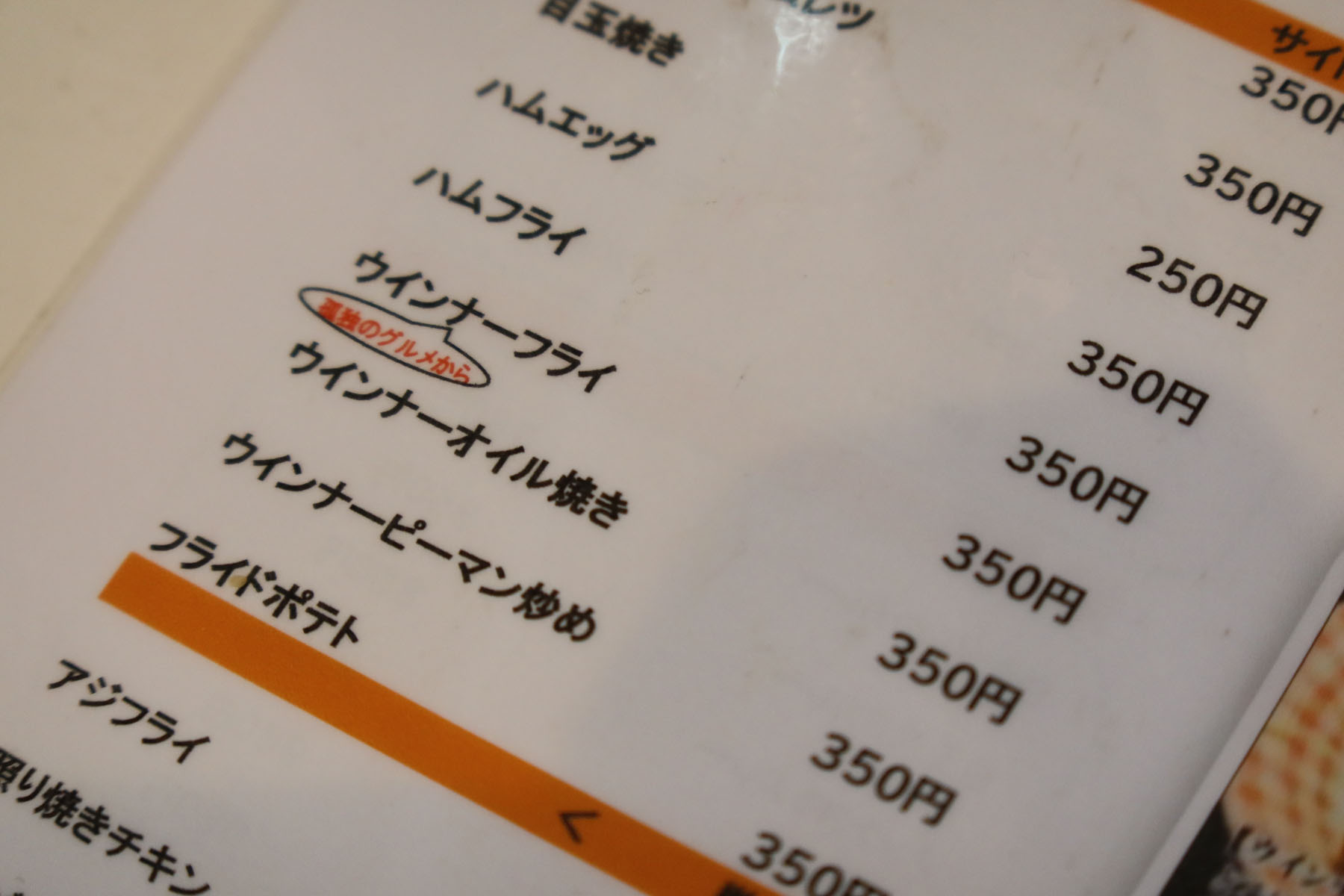 ウインナーフライは見たまんまの味ですが、何のウインナーをフライにしているかはわかりませんでした。一般流通していない業務用なんだろうと思います。皮薄め、ポーク系のように感じました。もっとも、皮厚めだったら揚げてる途中で爆発不可避だと思いますが。これだけでも充分立派なご飯のおかずです。体重制限かかってなかったら白いご飯を一杯いただくところでした。