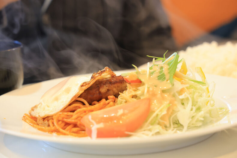 開店直後で暖房があまり効いていなかったというのもありますが、ハンバーグ(デミソース)目玉のせセットが運ばれてきた時の湯気がすごい。目玉焼きってこんな湯気出るんか!って思いました。この湯気の演出のために暖房控えめにしてるんんじゃないの?(穿ちすぎです)