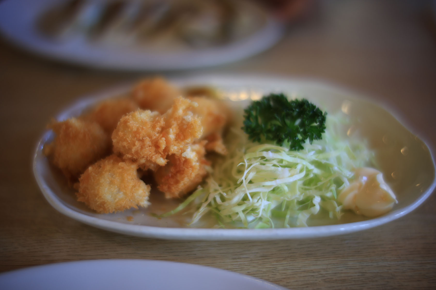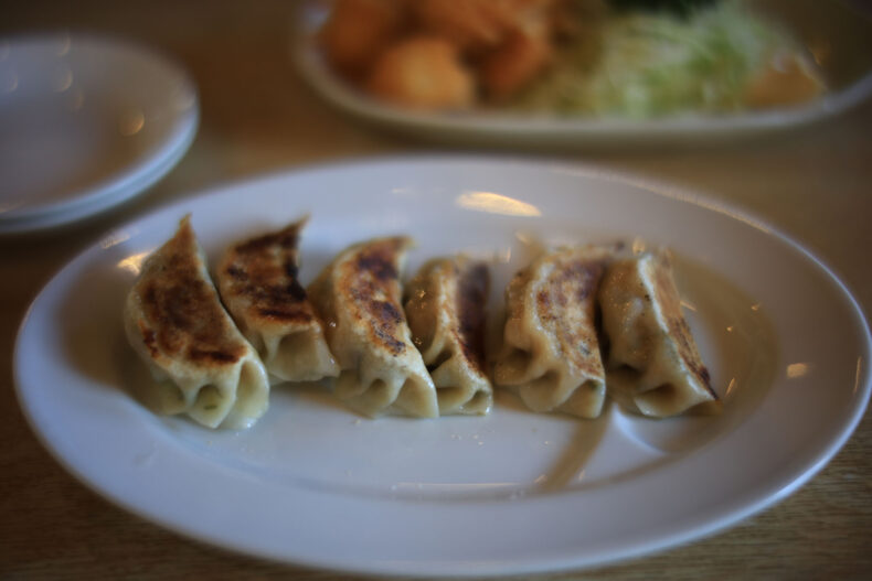 オーダーした料理が出てきました。最初にやってきたのは大葉餃子。ここからレンズがNOKTONになるので急にエモいボケボケ写真になります。