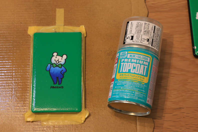 スペアはそうならないように、Mr.ホビーの光沢プレミアムトップコートでコーティングします。ただ、プラスチックの上に剥がれやすい塗膜が乗っているだけなので、これでいくらコーティングしても無力なのではないかという懸念はあります。