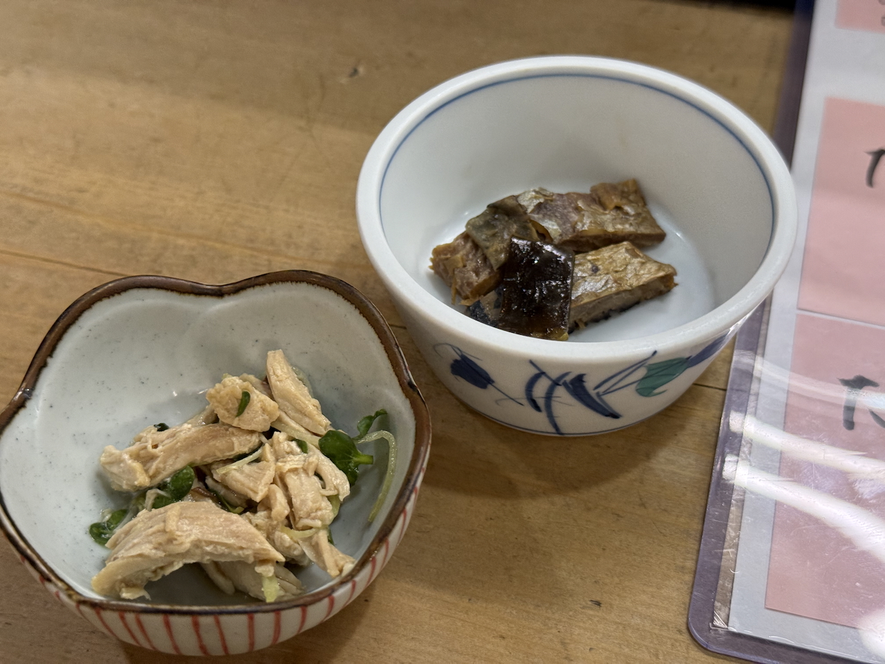 お通し。鶏の和え物と、にしん。のっけからいい感じです。