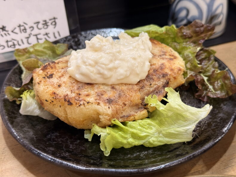 いもまんじゅうバター焼。芋と挽肉を固めてバターで焼き、タルタルソースを乗せた創作料理です。素材が全部美味いものなので、美味くないわけないです。2日目のポテトサラダをバターで焼いたものが少し似てるかも。
