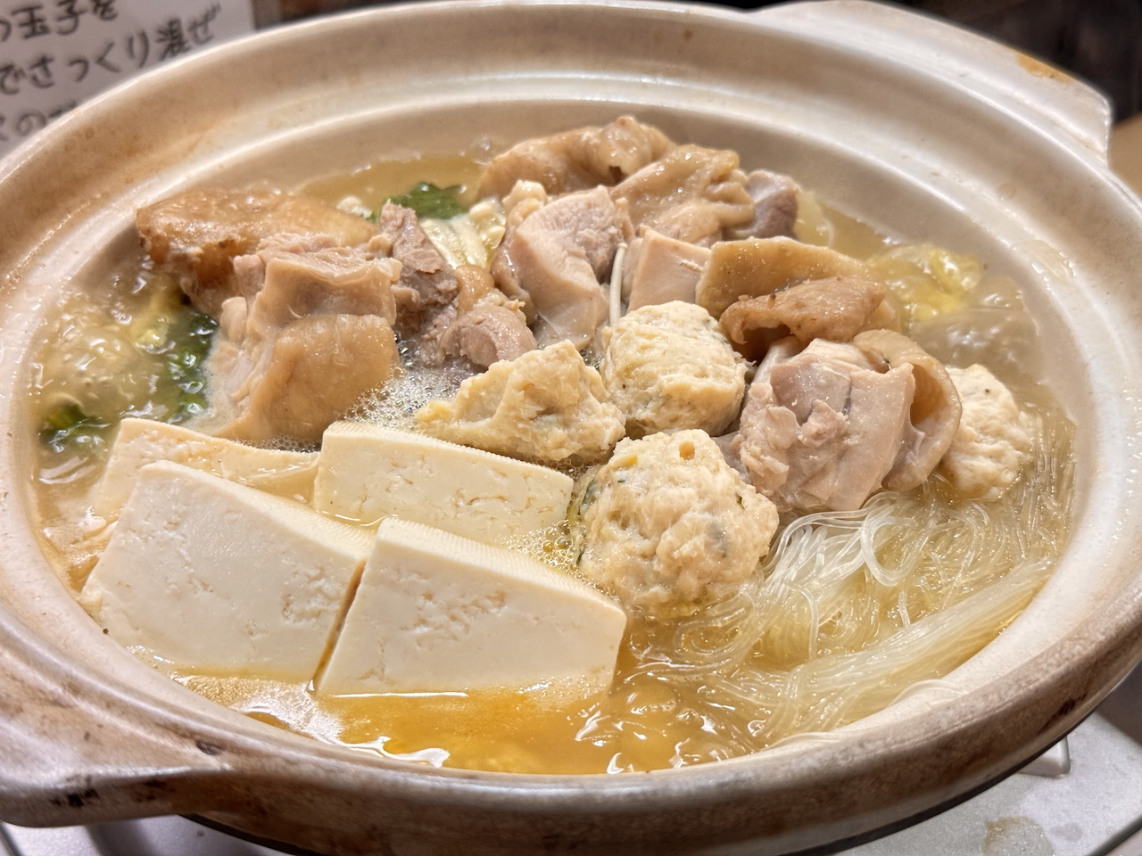そしてメイン、鶏の水炊き(2人分)登場。2人で1人分をシェアしても良かったのですが、もうここまでで料理とお酒の相乗効果でするすると食べてきてしまったので2人前行っちゃいました。