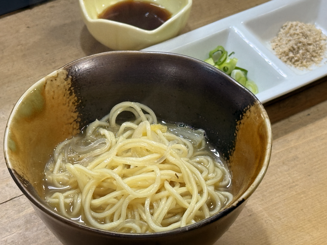 そして水炊きのスープから作った〆のラーメン。にんにく醤油をちょっと垂らすのがポイントのようで、鍋とはまた違う深みのある味になります。