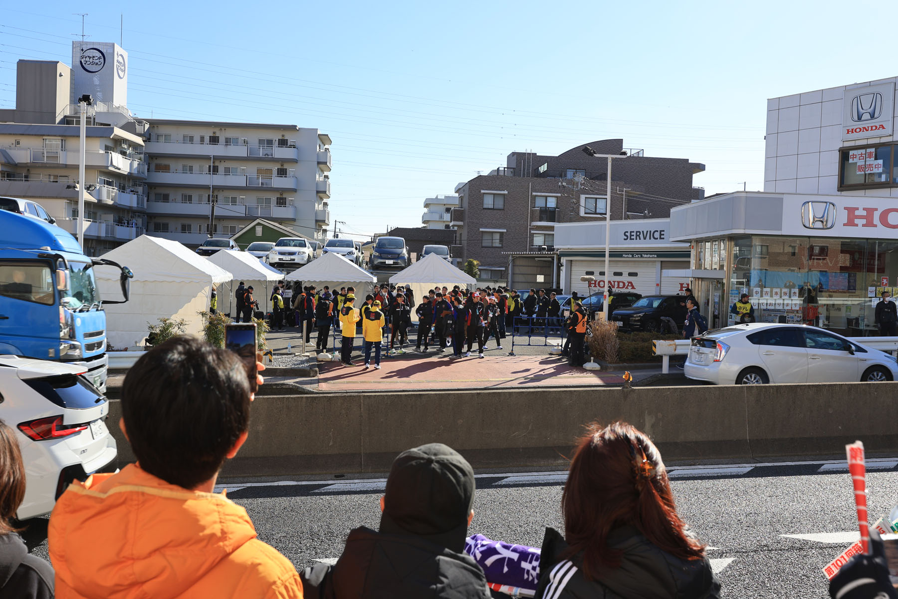 反対車線側に渡りました。ホンダのディーラーを使って囲み取材が行われているのが見えました。てっきり戸塚中継所でやってるのかと思いきや、そこから数十mほど東京寄りのホンダ店で行われてたとは。なお明日の復路はこの向かいのトヨタ店で囲み取材が行われるはずです。(明日の復路は都合がつかず観戦できません。)