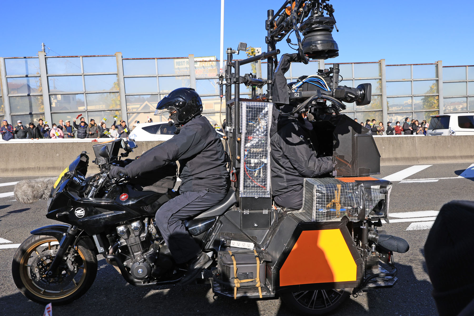 中継車の数々。これは先頭の前を走るメインカメラで、中継で一番長く映像が映るカメラです。スチル部隊も乗っていて、ここはEOS-1が多いですかね。SIRUIのストラップも見えます。SIRUI、報道分野にも食い込んでるんだ…。