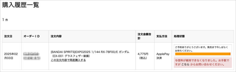 JAL Mallに注文していた「大阪万博のガンプラ」ですが、発売までまだ間があったせいか、Apple Payで支払った注文について「与信枠が維持できなくなりました」エラーが出ているようです。