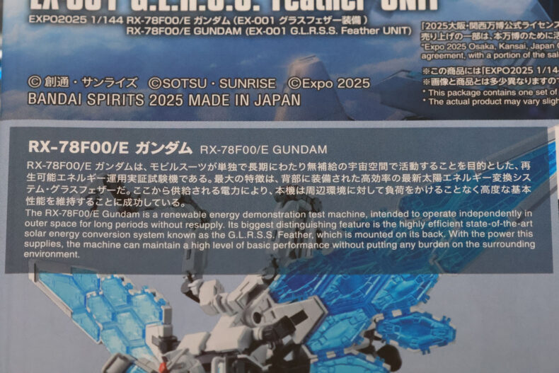 在庫はかなり潤沢なようで、どこの模型店でも入荷したところは山積み、プレミアムバンダイでも19:00時点で普通に買える状態でした。ミャクミャクは余計ですし羽が生えてるのなんなのとは思いますが、パッケージとしてはかなりかっこいい部類だと思います。特に左半分の絵の調子は他のガンプラのボックスアートにはみられないもの。