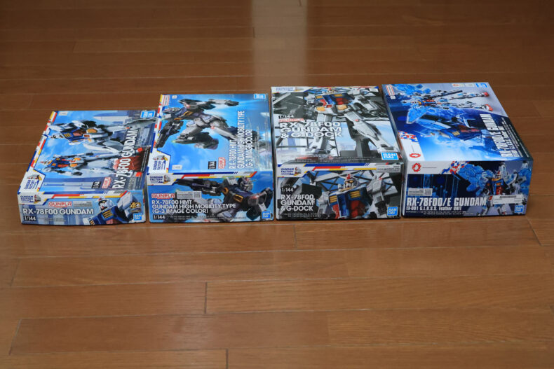 このガンダムは横浜ガンダム(RX-78F00)をベースにしていますので、過去の横浜ガンダムのガンプラと箱の大きさを比較してみました。左から素のF00、HMTタイプ/G3カラーのF00、F00のドック付き、F00万博ガンダムですが、万博ガンダムは HMTタイプより箱が厚く、F00 のドック付きと同じ大きさでした。冒頭で F00/E の箱絵を褒めましたが、横浜の F00 も MM21 地区が背景になっていて、これはこれで尊いんですけどね…。