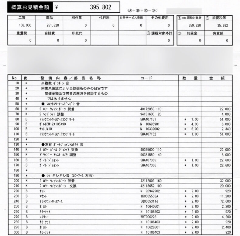 A3(8V)のフロント・リアの冷寒時のギシギシ音を修理したらいくらになるのか、見積もってもらいました、というか、勝手に見積もられました(笑。