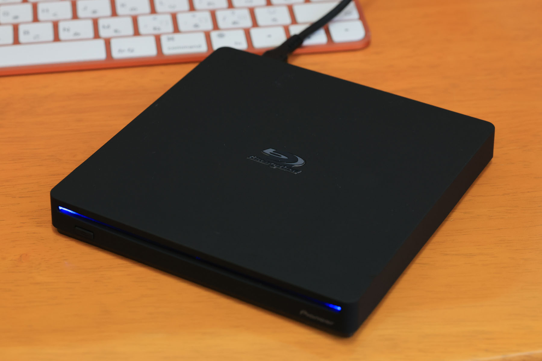 余計なのが1つ。このディスク挿入口両端にある青いLED。ディスクが入ってようが入っていまいが光ります。すなわちMac/PCにつながっており、電源オフではない限りは点灯(ディスクあり)・点滅(ディスクなし)しっぱなしです。ディスクが入ってないと点滅(フェード点滅)しっぱなしというのも良くない。Macはスリープ運用が基本なので、つまりずっとLEDが点いていることになります。これでは目障り。あくまで予備機として保管しておきます。常用するとなったら分解してLEDを外すか、配線を切ると思います。