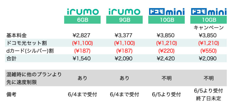 なんと、今なら終了時期未定で、ドコモ mini 10GB が irumo 9GB と同じ値段なんですね。これはかなり練られてますね。しかもほのかに期待させるのが「混雑時に他のプランより先に速度制限がかかる」と今の段階では明言されていないことです。逆に不安要因なのがシルバーのdカード払いによる割引が終了日未定のキャンペーンとして 220円 から 550円 に増額されていること。これはドコモの一存でいつでも止めることができるので、そうなると irumo と比べて +1GB ではあるものの +330円 と、少し割高になってしまいます。