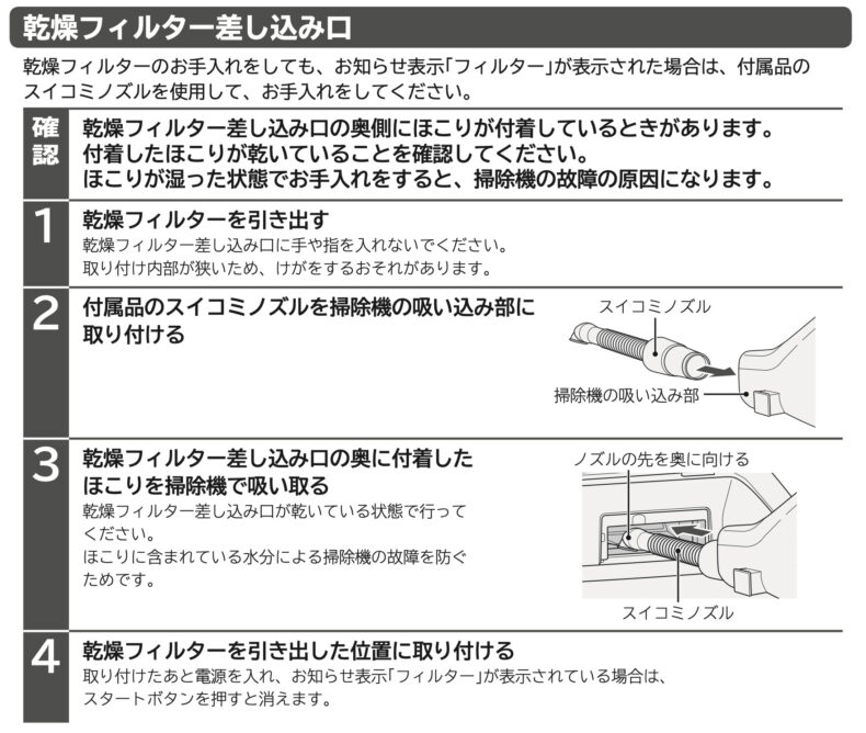 家の洗濯機(日立 BW-DW90E)が乾燥運転時、フィルター掃除をしても「フィルター」表示がすぐ出るようになってしまって、フィルターじゃないところが汚れてるのかなぁ…と説明書を見たところ、ビンゴな案内が!