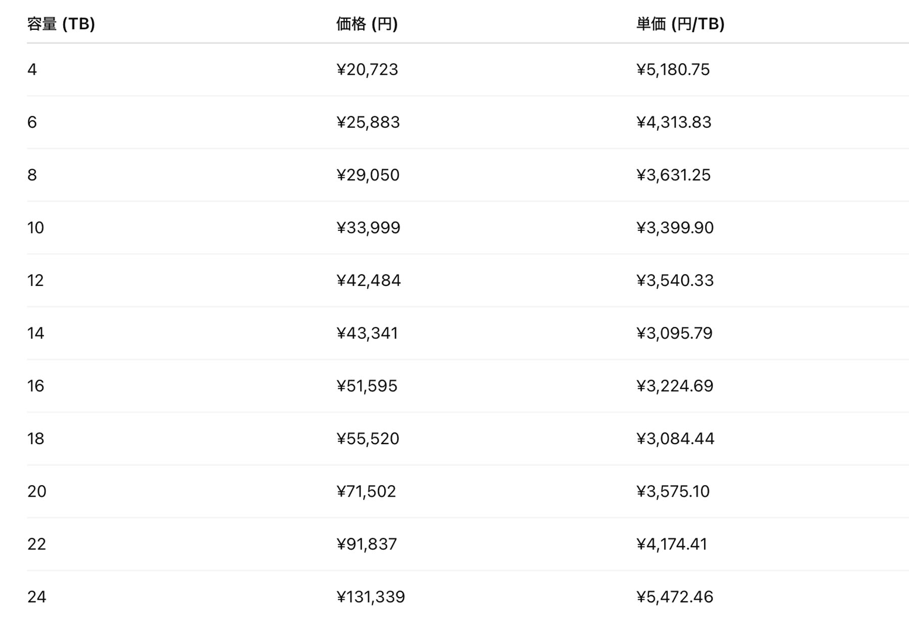 なんとまぁ、ボリュームゾーン(容量単価が一番安い)っていま、16TB と 18TB なんですね。コロナ前の感覚だと「1TB=2,200円だとバーゲン、2,500円だとまぁ安い、3,000円はまぁ普通」という水準でしたが、為替レート変動分を考えれば、16TB や 18TB モデルはコロナ前の普通の水準は下回ってるんですね。ちょっと 10TB 超えの HDD って視野に入ってなかったんですが、次に買い足すときにはこの辺りも考えてみようかと思います。
