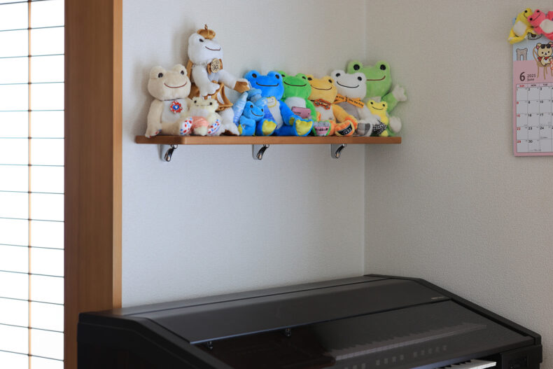 カエルがエレクトーンの上を占拠していて、いざエレクトーンを使おうと思った時に大量のカエルを片付けるところからしなければならないので、カエルを乗せるための棚をつけました。