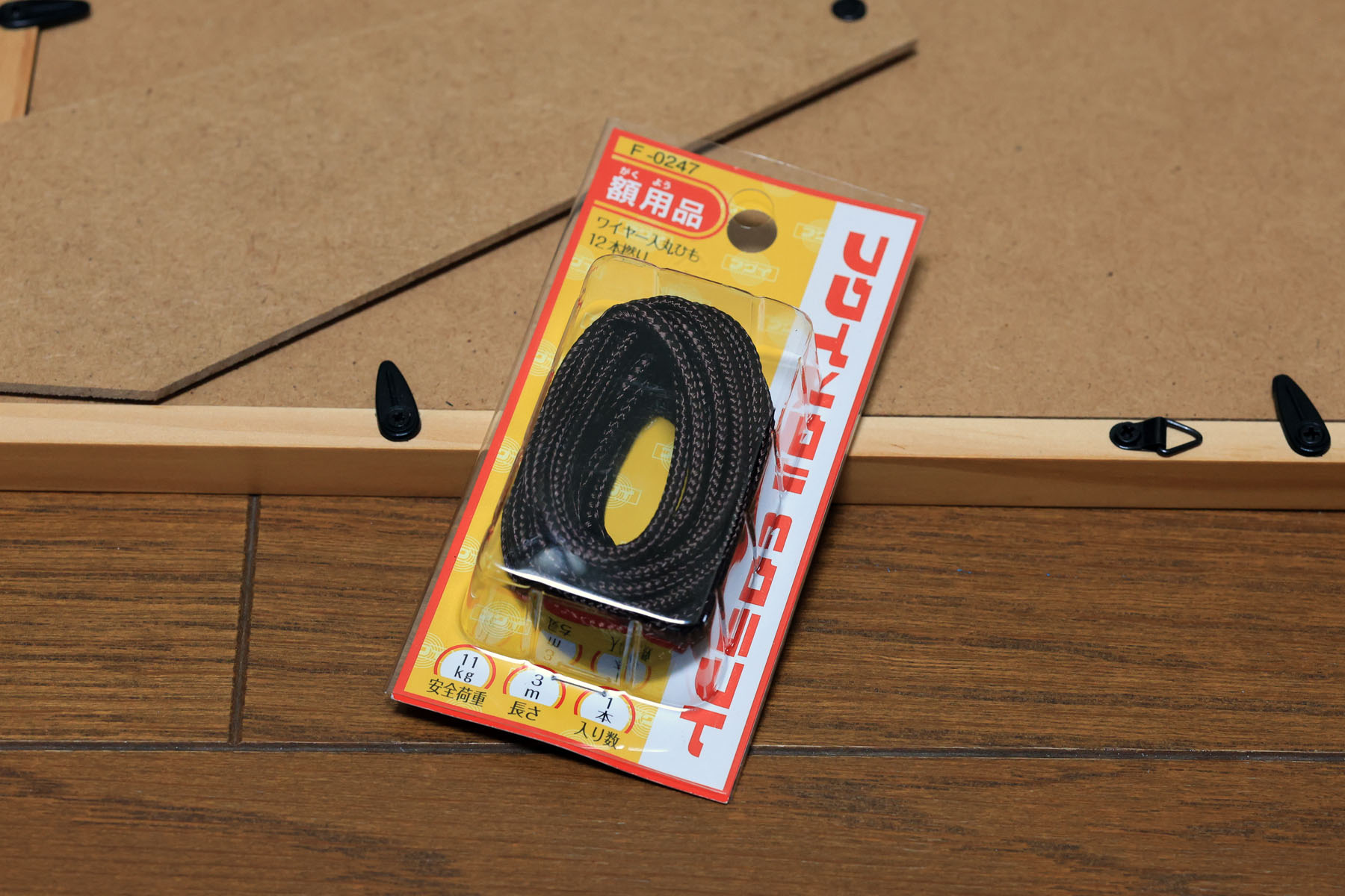 棚を作ったとき、今までかけていた額と干渉するので額の位置も上に持っていこうと、ぶら下げていた紐を持ち上げたところ紐がプツッと切れてしまい、額が落下。1mくらいの高さからの落下でしたが、ガラスが割れなくて良かったです。