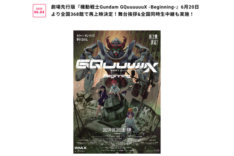 GQuuuuuuXが最終回直前の6/20(金)から再上映するとのこと。特典として『機動戦士Gundam GQuuuuuuX -Beginning-』DESIGN WORKS 3が配布されるとなれば行くしかないかな…とは思っていますが、どうもIMAXの部屋はトム・クルーズに占拠されているらしくうちの近所の映画館だとIMAX上映は1日1回っぽい。